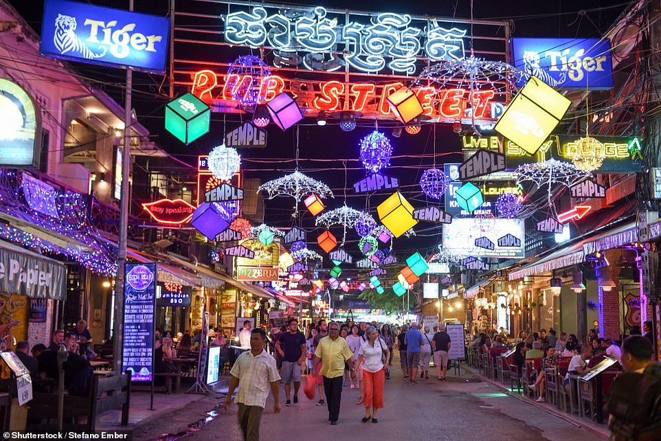 Feast for the eyes: Jeff Mills went on a whistlestop cooking tour in Cambodia. Pictured is ‘bustling’ Pub Avenue in Siem Reap